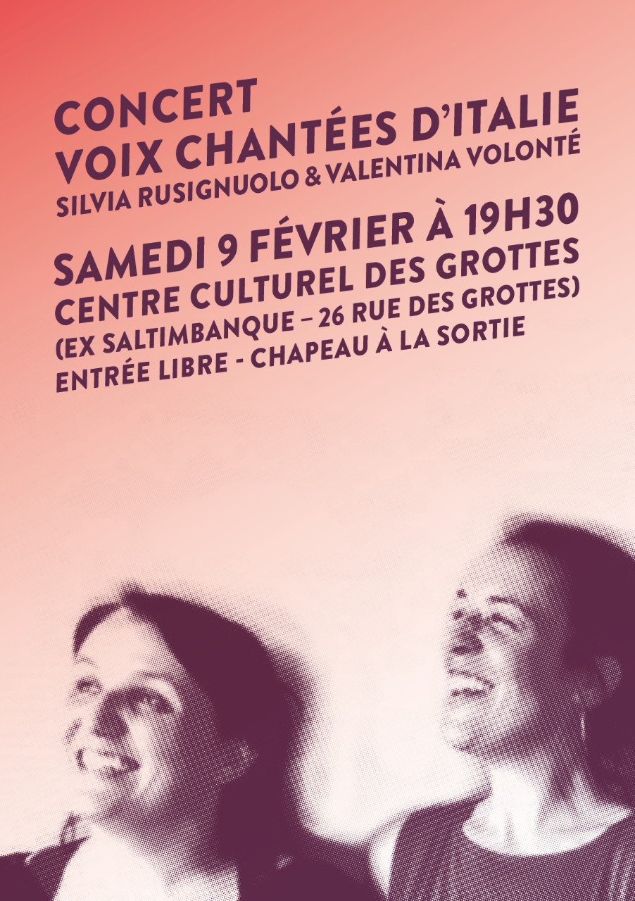 Silvia Rusignuolo et Valentina Volonté deux amies, deux chanteuses italiennes passionnées par le chant de tradition orale, nous accompagneront le long d'un voyage qui commence au-de-là des Alpes. Elles redonneront la voix aux femmes qui nous ont précédées sur un chemin de montagne, dans une usine, dans une rizière, là où il y avait une histoire à raconter.