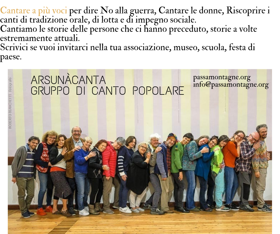 Storie di lotta per la libertà, di amore, di viaggio, di fatica e di festa. Storie a volte estrememamente attuali. I richiami che echeggiavano sugli alpeggi delle nostre montagne, gli arsunà, danno il nome a questo gruppo aperto a tutti quelli che vogliono sperimentare il cantare insieme a più voci non come performance, ma come modalità di relazione basata sull'ascolto reciproco. Come un telefono senza fili, il canto popolare si sposta e si traforma: cambiano i testi, le lingue, a volte le melodie. A testimoniare che la nostra identità è meticcia, sempre in movimento. Il nostro cantare, come i richiami, arriva da lontano e va ancora oltre...
