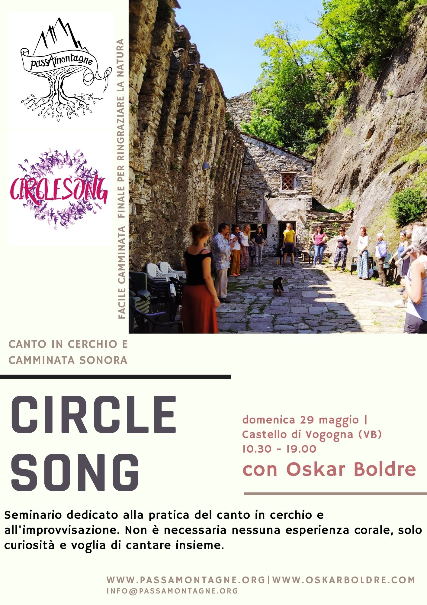 In pratica si faranno esercizi di affiatamento, di sviluppo dell'ascolto ed altri mirati a sviluppare la comprensione del gesto tra conduttore e coro. La giornata si concluderà con una camminata sonora: una facile e breve escursione immersi nel silenzio che ci porterà in un luogo a sorpresa ove dedicare il canto onorando la natura.