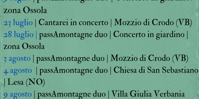 L'estate di passAmontagne tre formazioni diverse dal lago ai monti! Info in aggiornamento 14 giugno | Fine corso Cantare a più voci; a seguire Concerto Cantarei| Mastronauta Omegna 18 giugno |…